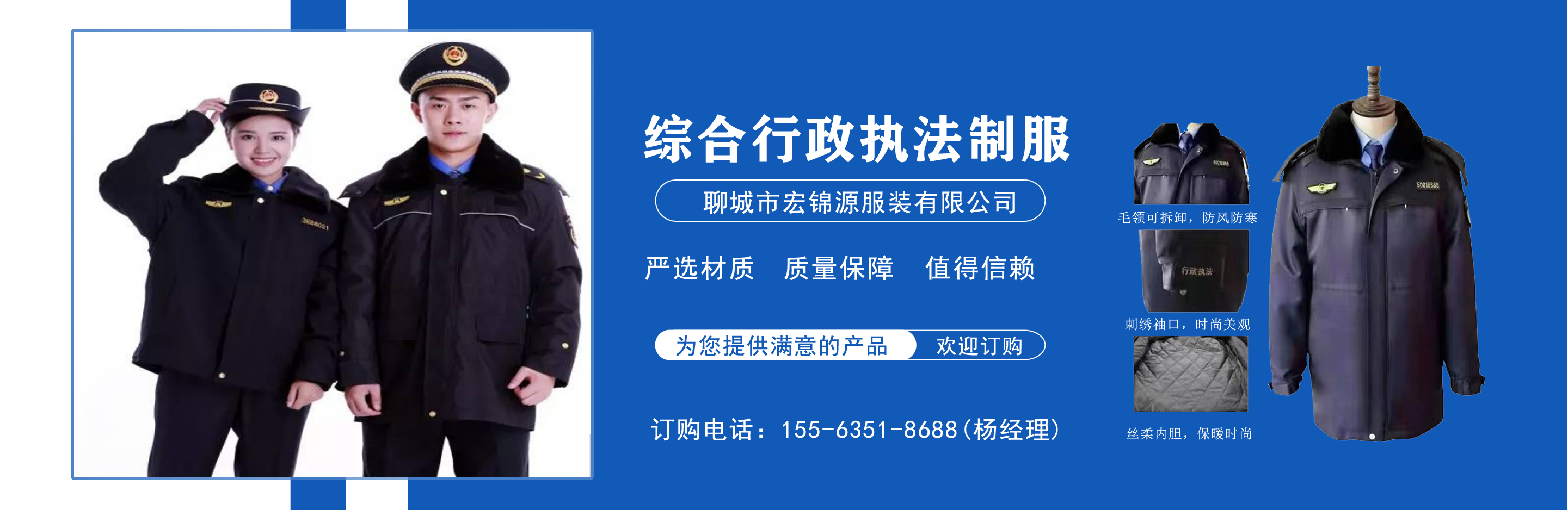 聊城市宏錦源服裝有限公司位于江北水城—山東聊城,地理位置優(yōu)越,交通便利。公司主營(yíng)綜合行政執(zhí)法制服,交通執(zhí)法服裝,應(yīng)急管理執(zhí)法標(biāo)志服,市場(chǎng)監(jiān)督管理標(biāo)志服,農(nóng)業(yè)執(zhí)法服裝,生態(tài)環(huán)境保護(hù)制服,文化市場(chǎng)執(zhí)法服,城管標(biāo)志服裝廠,衛(wèi)生監(jiān)督制服,六部門(mén)標(biāo)志服廠家等,值得信賴(lài)! 公司生產(chǎn)的標(biāo)志服裝據(jù)有造型美、板型新、多次水洗不退色、不變型、不起泡。 “認(rèn)真辦事,踏實(shí)做人”是宏錦源的企業(yè)精神,我們的宗旨是:“用服務(wù)與真誠(chéng)來(lái)?yè)Q取你的信任與支持,互惠互利,共創(chuàng)雙贏!”我公司愿與國(guó)內(nèi)外各界同仁志士竭誠(chéng)合作,共創(chuàng)未來(lái)企業(yè)目標(biāo):在已選定的服飾領(lǐng)域中,成為行業(yè)的卓越者。 經(jīng)營(yíng)理念:追求產(chǎn)品卓越,為用戶提供完美、高效的服務(wù)。...